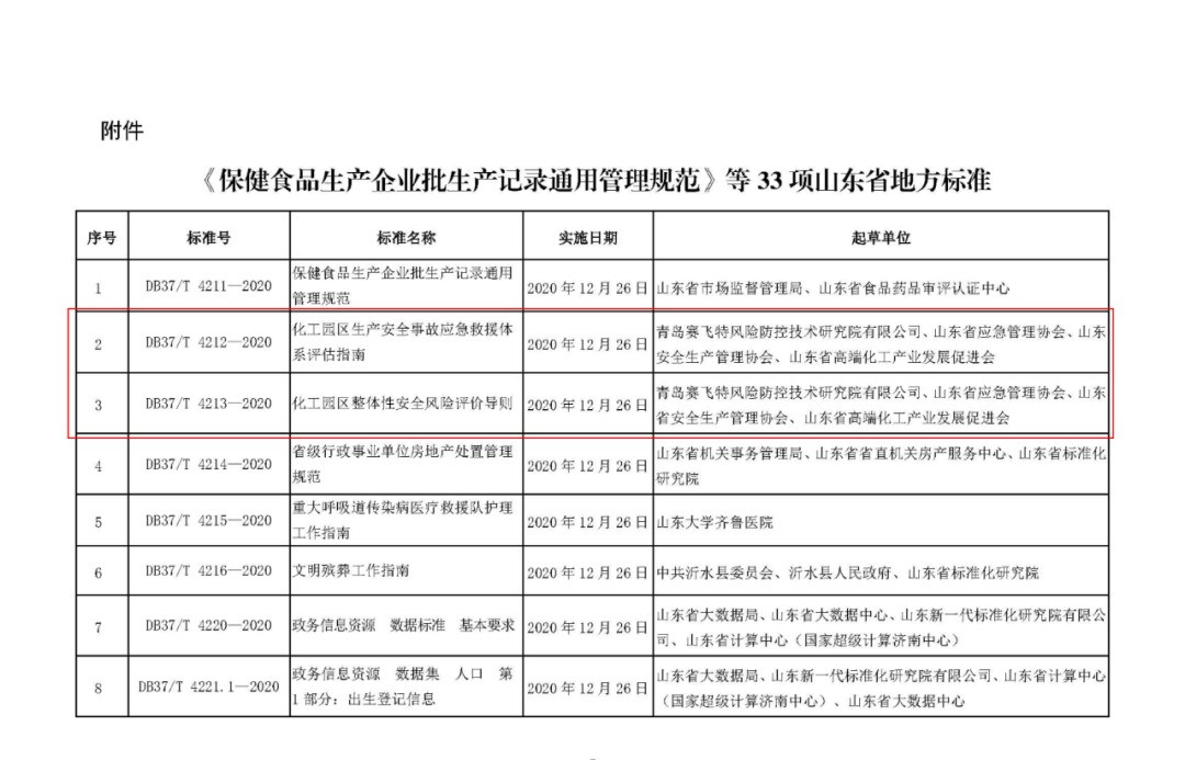 近日,山東省市場監(jiān)督管理局批準發(fā)布了33項山東省地方標準。其中的《化工園區(qū)生產(chǎn)安全事故應急救援體系評估指南》(DB37/T 4212-2020)、《化工園區(qū)整體性安全風險評價導則》(DB37/T 4213-2020)由青島賽飛特風險防控技術(shù)研究院有限公司、山東省應急管理協(xié)會、山東省安全生產(chǎn)管理協(xié)會、山東省高端化工產(chǎn)業(yè)發(fā)展促進會聯(lián)合起草,現(xiàn)分享給各位:
