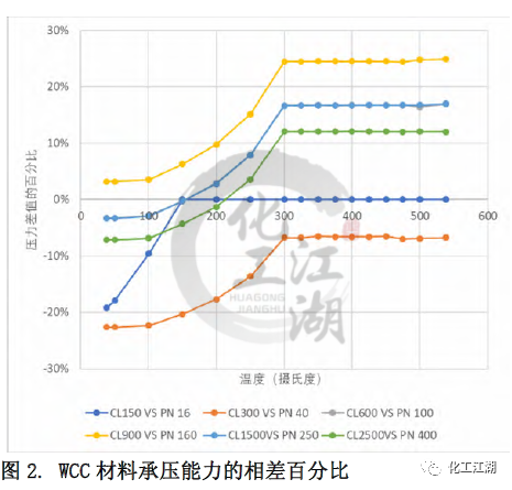 本文采用了對比冷(常溫)工作壓的方法來近似推算出與ASME標(biāo)準(zhǔn)Class壓力等級最鄰近的EN標(biāo)準(zhǔn)PN壓力等級。EN12516-1標(biāo)準(zhǔn)中列出的所有材料的冷工作壓都是相同的。而ASME B16.34標(biāo)準(zhǔn)中列出的冷工作壓和材料相關(guān),故選取了其中一種較強(qiáng)材料(C12A)的冷工作壓用于對比。 通過對比得到每個(gè)ASME標(biāo)準(zhǔn) Class壓力等級對應(yīng)的最鄰近的EN標(biāo)準(zhǔn) PN壓力等級,見表1。同時(shí),這樣的對應(yīng)關(guān)系也和閥門設(shè)計(jì)的通用做法一致。本文的管道內(nèi)徑,最小壁厚,材料承壓能力的對比都是依照表1中的對應(yīng)關(guān)系來進(jìn)行的。 1.2 材質(zhì)承壓能力的對比 無論是ASME標(biāo)準(zhǔn)還是EN標(biāo)準(zhǔn)都列出了一些ASTM標(biāo)準(zhǔn)材料的壓力溫度等級,即材料在不同溫度下的承壓能力。本文選取了常見的閥體材料:碳鋼WCC,合金鋼 WC9和C12A進(jìn)行研究,來對比兩個(gè)標(biāo)準(zhǔn)中相同材料在標(biāo)準(zhǔn)壓力等級下的承壓能力的差別。 圖1和圖 2顯示了WCC材料的溫度壓力曲線和Class與PN的對比,可以看出: (1)對于ASME的 Class 150和EN12516-1 的PN16,當(dāng)溫度低于150攝氏度時(shí),EN標(biāo)準(zhǔn)規(guī)定的材料承壓能力低于ASME標(biāo)準(zhǔn)規(guī)定的材料承壓能力,且隨著溫度升高,差距逐漸縮小。當(dāng)溫度高于150攝氏度時(shí),兩個(gè)標(biāo)準(zhǔn)對相同材料的承壓能力的規(guī)定近乎相同。 (2)對于ASME的 Class 300和EN12516-1 的PN40,在整個(gè)溫度的范圍內(nèi),EN標(biāo)準(zhǔn)規(guī)定的材料承壓能力均低于ASME標(biāo)準(zhǔn)規(guī)定的材料承壓能力。當(dāng)溫度低于300攝氏度時(shí),隨著溫度升高,差距逐漸縮小。當(dāng)溫度高于300攝氏度時(shí),兩個(gè)標(biāo)準(zhǔn)對相同材料的承壓能力的規(guī)定差別趨于一致,約為-7%。 (3)對于ASME的 Class 900和EN12516-1 的PN160, 在整個(gè)溫度的范圍內(nèi),EN標(biāo)準(zhǔn)規(guī)定的材料承壓能力均高于ASME標(biāo)準(zhǔn)規(guī)定的材料承壓能力。當(dāng)溫度低于300攝氏度時(shí),隨著溫度升高,差距越來越大。當(dāng)溫度高于300攝氏度時(shí),兩個(gè)標(biāo)準(zhǔn)對相同材料的承壓能力的規(guī)定差別趨于一致,約為24%。 (4)還有一點(diǎn)值得注意的,除了PN16,其他PN壓力等級對應(yīng)的工作壓力在低于300攝氏度以下都是一樣的,而ASME等級對應(yīng)的工作壓力是隨著溫度升高持續(xù)下降的。 1.3 對閥體設(shè)計(jì)的指導(dǎo) 在實(shí)際設(shè)計(jì)過程中,無論是為了縮短新產(chǎn)品推向市場的時(shí)間,還是從產(chǎn)品標(biāo)準(zhǔn)化、成本優(yōu)化的角度去考慮,盡可能多地將已有的設(shè)計(jì)或者零部件(尤其是需要開發(fā)鑄造模具的閥體)應(yīng)用到新的產(chǎn)品中,都是設(shè)計(jì)師不可避免要考慮的問題,可以采用同一個(gè)閥體鑄件的設(shè)計(jì)來滿足ASME 標(biāo)準(zhǔn)和EN標(biāo)準(zhǔn)的要求呢?為了解答這個(gè)問題,本文選取了三個(gè)不同壓力等級-低、中、高的十二個(gè)具體實(shí)例,各項(xiàng)參數(shù)的對比結(jié)果如表3 所示。 (1)低壓ASME Class 300與 EN PN40 從表3中差別的百分?jǐn)?shù)可以看出,在兩個(gè)尺寸下,滿足ASME標(biāo)準(zhǔn)和EN 標(biāo)準(zhǔn)的管道內(nèi)徑和最小壁厚的差別,均小于5%。就是說,用同一個(gè)閥體設(shè)計(jì)來滿足兩個(gè)標(biāo)準(zhǔn)的設(shè)計(jì)要求是可以接受的。同時(shí)從圖2中可以看出,閥體常見材料在這兩個(gè)等級的承壓能力差別也較小,10%以內(nèi)。因此,兩個(gè)設(shè)計(jì)可以在類似的實(shí)際工況中應(yīng)用。 (2)中壓ASME Class 900與 EN PN160 對于中壓下尺寸為DN100和DN200的兩組設(shè)計(jì),從差別的百分?jǐn)?shù)可以看出,雖然每組中要對比的兩個(gè)設(shè)計(jì)的管道內(nèi)徑非常接近,但是所要求的最小壁厚卻相差較多,超過了20%。在這種情況下,實(shí)踐中也是可以用同一個(gè)閥體設(shè)計(jì)來滿足兩個(gè)標(biāo)準(zhǔn)的設(shè)計(jì)要求的,但是需要評估由此帶來的對最小壁厚要求較小的閥體的成本的影響。另一方面,從圖2中可以看出,閥體常見材料在這兩個(gè)等級的承壓能力差別較大,在有些溫度下差別達(dá)到20%。這種材料承壓能力上的差別和最小壁厚的差別是一致的。 (3)高壓ASME Class 2500與EN PN400 對于高壓下尺寸為DN100和DN200,閥門的管道內(nèi)徑和最小壁厚存在著巨大差別,30%-50%,故采用同一個(gè)閥體設(shè)計(jì)來滿足兩個(gè)標(biāo)準(zhǔn)的設(shè)計(jì)要求是不合理的。 還有另外一個(gè)因素需要在閥體設(shè)計(jì)時(shí)考慮,那就是閥體兩個(gè)端口之間的長度。ASME B16.34中指出可以按照ASME B16.10來確定端口對端口尺寸。EN12516-1 并未提及端口對端口尺寸,但歐標(biāo)體系中EN558規(guī)定了端口對端口的尺寸。考慮到端口對端口尺寸并非標(biāo)準(zhǔn)強(qiáng)制要求,故本文未提供ASME B16.10和EN558的區(qū)別。 (1)管道內(nèi)徑 ASME標(biāo)準(zhǔn)和EN標(biāo)準(zhǔn)在管道內(nèi)徑的主要差別在于管道內(nèi)徑是否隨著壓力等級的變化而變化。閥體設(shè)計(jì)時(shí),管道內(nèi)徑的差異會進(jìn)一步放大閥門最小壁厚的差異。 (2)最小壁厚 兩個(gè)標(biāo)準(zhǔn)在閥門最小
