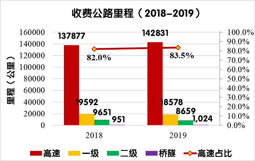2019年末,全國收費公路里程17.11萬公里,占公路總里程501.25萬公里的3.4%。其中,高速公路14.28萬公里,一級公路1.86萬公里,二級公路0.87萬公里,獨立橋梁及隧道1024公里,占比分別為83.5%、10.9%、5.1%和0.6%。