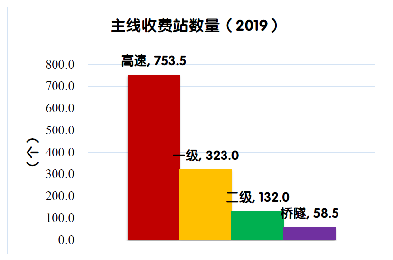 2019年末,全國收費公路共有主線收費站1267個,比上年末凈減少49個。其中,高速公路753.5個,一級公路323個,二級公路132個,獨立橋梁及隧道58.5個,占比分別為59.5%、25.5%、10.4%和4.6%。