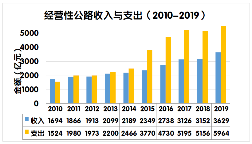 2019年度,全國經(jīng)營性公路收支平衡結(jié)果為-2334.9億元。其中,經(jīng)營性高速公路收支缺口2284.7億元,一級公路收支缺口53.1億元,二級公路收支缺口3.7億元,獨立橋梁及隧道收支盈余6.6億元。