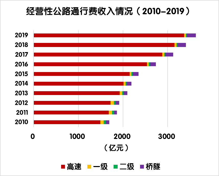 與上年相比,經(jīng)營性公路車輛通行費總收入由3410.1億元增加到3628.9億元,凈增218.7億元,增長6.4%。其中,高速公路由3152.4億元增加到3368.1億元,凈增215.7億元,增長6.8%;一級公路由48.0億元減少到41.9億元,凈減6億元,下降12.6%;二級公路由25.4億元減少到23.5 億元,凈減1.9億元,下降7.6%;獨立橋梁及隧道由184.3億元增加到195.3億元,凈增11億元,增長6.0%。