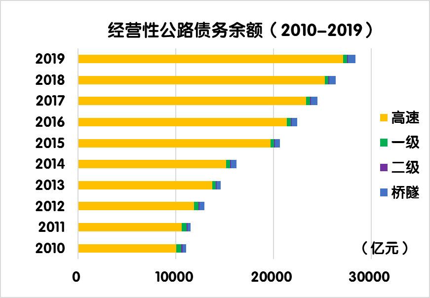 與上年末相比,經(jīng)營性公路債務(wù)余額由26377.5億元增加到28387.6 億元,凈增2010.1 億元,增長7.6%。其中,經(jīng)營性高速公路債務(wù)余額由25245.9 億元增加到27154.9 億元,凈增1909.0 億元,增長7.6%。