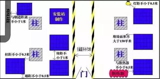 儲(chǔ)存物品與風(fēng)管、供暖管道、散熱器的距離不應(yīng)小于0.5米。與供暖機(jī)組、風(fēng)管爐、煙道之間的距離在各個(gè)方向上都不應(yīng)小于1米。《倉(cāng)儲(chǔ)場(chǎng)所消防安全管理通則》(GA1131-2014)6.14