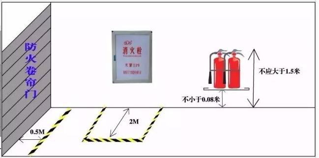 防火卷簾門兩側(cè)各0.5m范圍內(nèi)不得堆放物品,并應(yīng)用黃色標(biāo)識(shí)線劃定范圍?!度藛T密集場(chǎng)所消防安全管理》(GA654-2006)8.3.7