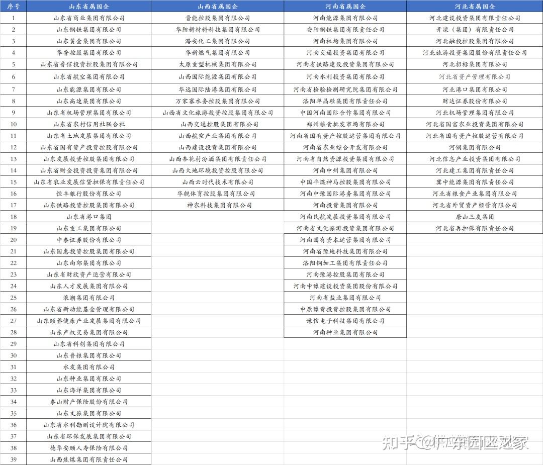 根據(jù)各地國資委披露的監(jiān)管企業(yè)名錄,山河四省共有省屬國企103家,數(shù)量上占全國比重的16%左右。其中,山東省屬國企38家、山西省屬國企18家,河南28家,19家。具體名錄如下,下表山西焦煤應(yīng)為山西省屬國企: