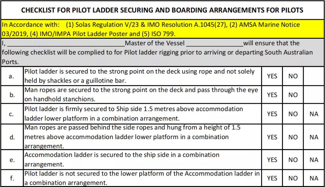·在抵達(dá)南澳大利亞港口之前,所有船長(zhǎng)都應(yīng)填寫(xiě)隨附的引航梯固定和登船安排清單。
