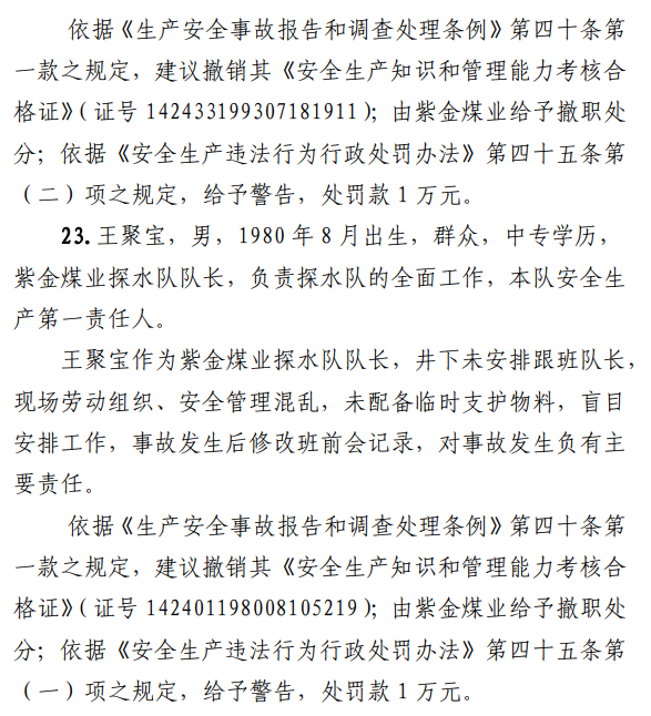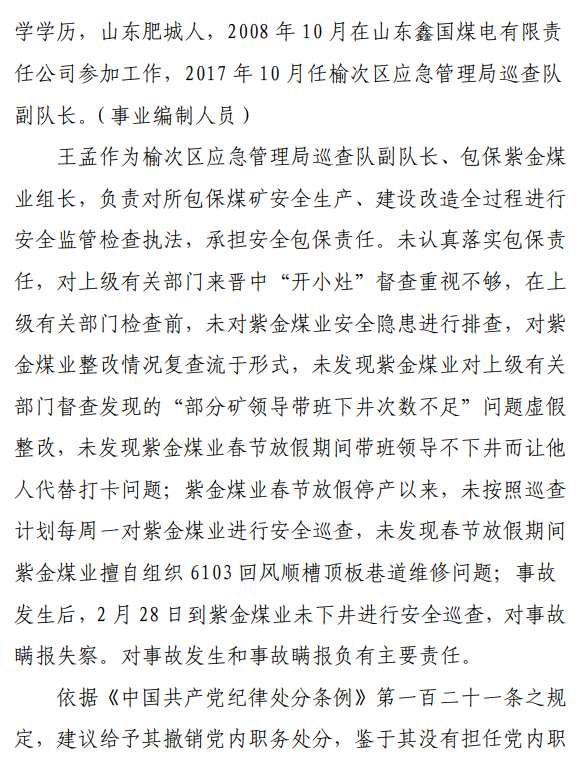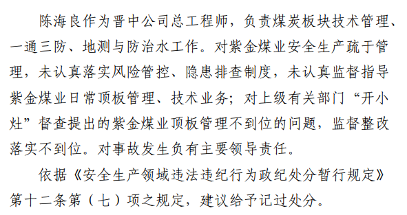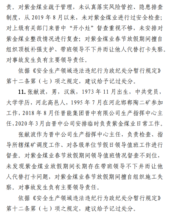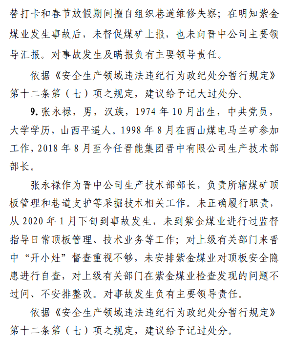 2月23日20時(shí)44分,探水隊(duì)副隊(duì)長(zhǎng)王志平通過(guò)6103回風(fēng)順槽距開(kāi)口950m處的電話,向礦調(diào)度室匯報(bào)了事故情況。20時(shí)46分,調(diào)度值班人員張宏強(qiáng)向礦長(zhǎng)郭英杰匯報(bào)事故情況。郭英杰立即啟動(dòng)應(yīng)急救援預(yù)案,組織煤礦相關(guān)人員開(kāi)展搶險(xiǎn)救援工作。救援人員使用單體液壓支柱、半圓木、鉸接梁對(duì)事故地點(diǎn)外圍巷道進(jìn)行臨時(shí)支護(hù),然后由外到里清渣、支護(hù),實(shí)施救援。被冒落頂板埋壓的劉永生、馬練水和王秀國(guó)于2月24日14時(shí)30分、2月25日6時(shí)30分、2月25日14時(shí)分別被救出升井。經(jīng)醫(yī)生在井口確認(rèn),3人已無(wú)生命體征,之后被送往榆次區(qū)殯儀館,搶險(xiǎn)救援工作結(jié)束。事故瞞報(bào)、謊報(bào)經(jīng)過(guò)2月24日,礦長(zhǎng)郭英杰安排信息中心主任梁煥修改人員定位系統(tǒng),關(guān)閉了工業(yè)視頻,刪除調(diào)度錄音通訊、虹膜數(shù)據(jù)。2月25日17時(shí)許,紫金煤業(yè)紀(jì)檢書(shū)記、黨總支副書(shū)記高建忠(臨時(shí)主持紫金煤業(yè)董事會(huì)及黨務(wù)日常事務(wù))和礦長(zhǎng)郭英杰組織召開(kāi)煤礦管理層會(huì)議。會(huì)上郭英杰、高建忠、紫金煤業(yè)安全生產(chǎn)技術(shù)總監(jiān)南海為了瞞報(bào)事故,對(duì)偽造出入井?dāng)?shù)據(jù)、修改人員定位數(shù)據(jù)、銷(xiāo)毀調(diào)度電話錄音、刪除視頻監(jiān)控資料、清理井下事故現(xiàn)場(chǎng)等事項(xiàng)進(jìn)行了安排。2月24日至25日,高建忠安排生產(chǎn)副礦長(zhǎng)杜永忠、安全副礦長(zhǎng)楊雙喜等人與遇難者家屬協(xié)商辦理賠償事宜,并安排遇難者家屬配合礦方瞞報(bào)事故。3月5日,在榆次區(qū)人民政府組織的核查過(guò)程中,郭英杰、高建忠均否認(rèn)事故發(fā)生,郭英杰、高建忠、南海繼續(xù)安排煤礦有關(guān)工作人員瞞報(bào)事故。3月8日上午9時(shí)許,在榆次區(qū)人民政府已查實(shí)事故、正在擬文上報(bào)的期間,紫金煤業(yè)向山西煤銷(xiāo)晉中公司、榆次區(qū)應(yīng)急管理局和晉中煤監(jiān)分局電話匯報(bào)事故,稱三名巡檢人員走到事故地點(diǎn)時(shí),頂板突然冒落導(dǎo)致事故發(fā)生,謊報(bào)了事故的經(jīng)過(guò)和原因。2月23日22時(shí)左右,武全珍在井下安排王家偉完善措施內(nèi)容。王家偉出井后在措施中增加了:“頂板較完整區(qū)域補(bǔ)強(qiáng)支護(hù)期間采用單體支柱+鉸接頂梁做臨時(shí)支護(hù),頂板不平整處使用方木墊平、木楔背緊背實(shí)”,和“臨時(shí)支護(hù)安全技術(shù)措施”相關(guān)內(nèi)容。2月24日上午,武全珍安排王家偉在該措施中增加了“絞車(chē)運(yùn)輸安全技術(shù)措施”和“移動(dòng)乳化液泵使用安全技術(shù)措施”等內(nèi)容。3月8日,生產(chǎn)礦長(zhǎng)杜永忠安排探水隊(duì)隊(duì)長(zhǎng)王聚寶在班前會(huì)記錄中加上“先抽400米水”。當(dāng)天晚上,安全礦長(zhǎng)楊雙喜在在班前會(huì)記錄中加上“不準(zhǔn)進(jìn)尺,打好臨時(shí)支護(hù)再作業(yè)”等內(nèi)容。現(xiàn)場(chǎng)人員在無(wú)臨時(shí)支護(hù)的情況下違章進(jìn)行補(bǔ)強(qiáng)支護(hù)作業(yè),施工過(guò)程中頂板失穩(wěn)冒落,導(dǎo)致事故發(fā)生。1.紫金煤業(yè)對(duì)處于極限平衡狀態(tài)的6103回風(fēng)順槽頂板存在的安全隱患辨識(shí)不清、安全風(fēng)險(xiǎn)管控不力6103回風(fēng)順槽巷道埋深大、圍巖較軟,且為迎采對(duì)掘巷道,受臨近的6101工作面開(kāi)采動(dòng)壓影響大,多根錨桿錨索斷裂失效,巷道變形,底板鼓起,事故地點(diǎn)附近巷道頂板已處于高應(yīng)力的極限平衡狀態(tài)。事故發(fā)生前,事故地點(diǎn)附近巷道頂板已先后發(fā)生兩次冒落。紫金煤業(yè)對(duì)6103回風(fēng)順槽頂板存在的安全隱患辨識(shí)不清、重視不夠,未切實(shí)進(jìn)行礦壓日常監(jiān)測(cè)分析,未對(duì)斷裂失效錨桿及時(shí)補(bǔ)強(qiáng)支護(hù),施工時(shí)未采取臨時(shí)支護(hù),安全風(fēng)險(xiǎn)管控不力。2.紫金煤業(yè)技術(shù)管理工作有漏洞,《6103回風(fēng)順槽補(bǔ)強(qiáng)支護(hù)施工安全技術(shù)措施》對(duì)現(xiàn)場(chǎng)作業(yè)指導(dǎo)性差紫金煤業(yè)編制的《6103回風(fēng)順槽補(bǔ)強(qiáng)支護(hù)施工安全技術(shù)措施》對(duì)巷道補(bǔ)強(qiáng)支護(hù)作業(yè)的臨時(shí)支護(hù)形式、技術(shù)參數(shù)和要求不具體,對(duì)現(xiàn)場(chǎng)作業(yè)指導(dǎo)性差。生產(chǎn)技術(shù)科科長(zhǎng)王家偉編制措施前未到6103回風(fēng)順槽實(shí)地查看頂板情況,生產(chǎn)礦長(zhǎng)杜永忠、安全礦長(zhǎng)楊雙喜、總工程師武全珍及相關(guān)部門(mén)負(fù)責(zé)人會(huì)審措施時(shí)審查把關(guān)不嚴(yán),措施僅由探水隊(duì)隊(duì)長(zhǎng)在班前會(huì)進(jìn)行宣讀,學(xué)習(xí)貫徹不到位。3.6103回風(fēng)順槽補(bǔ)強(qiáng)支護(hù)作業(yè)勞動(dòng)組織混亂,現(xiàn)場(chǎng)安全監(jiān)管缺位事故當(dāng)班,在探水隊(duì)隊(duì)長(zhǎng)提出本隊(duì)人員不熟悉支護(hù)作業(yè)的情況下,礦領(lǐng)導(dǎo)違章指揮,仍然抽調(diào)安監(jiān)科和探