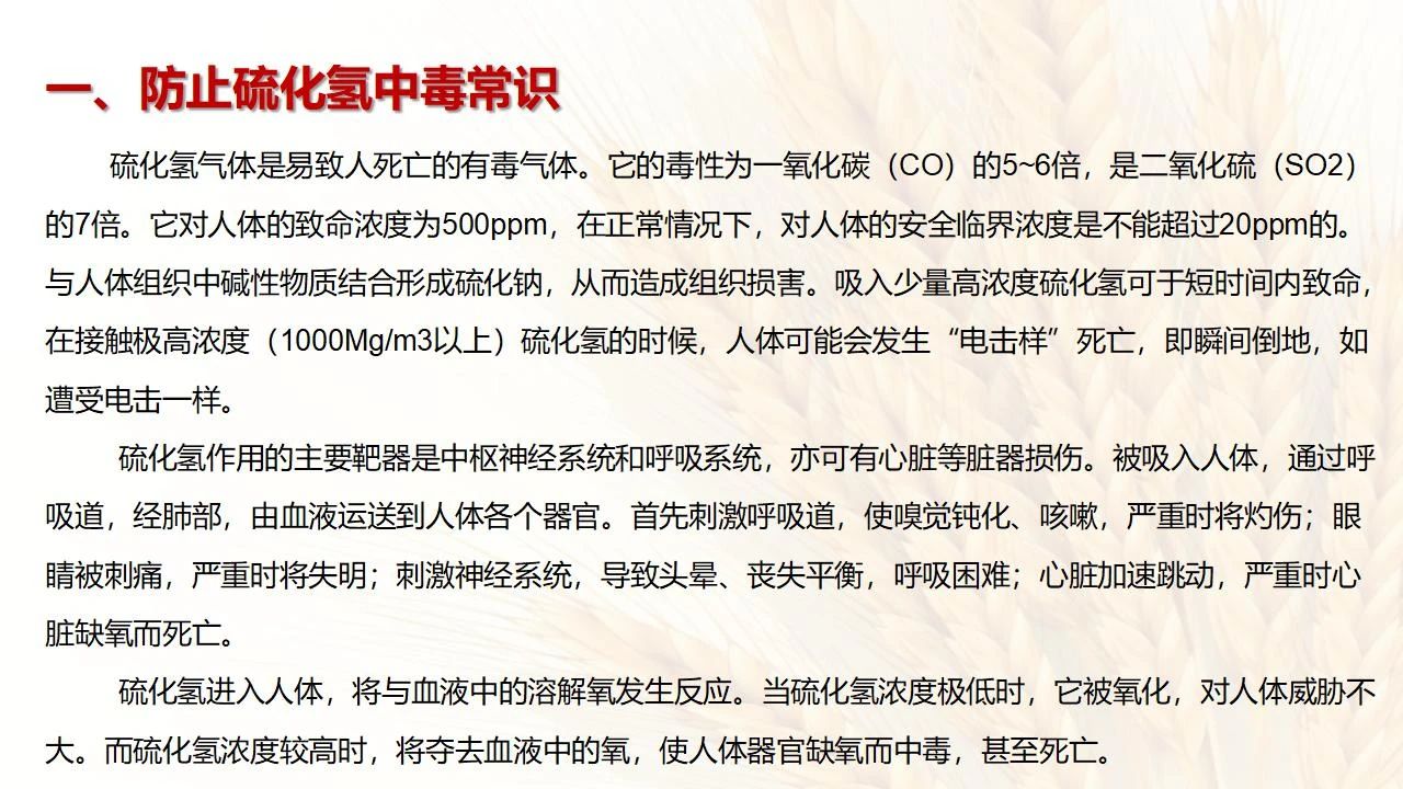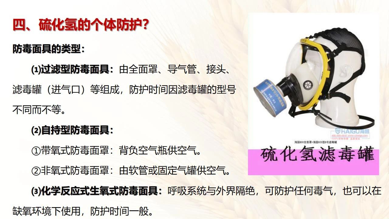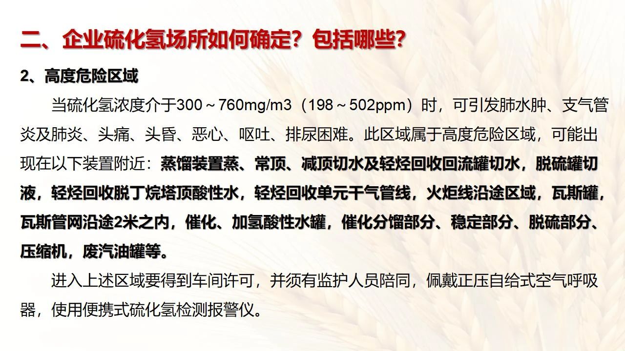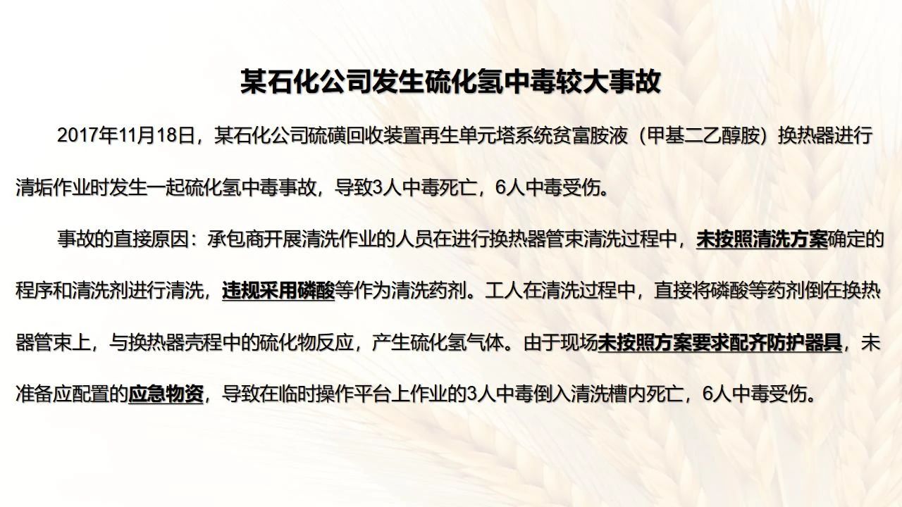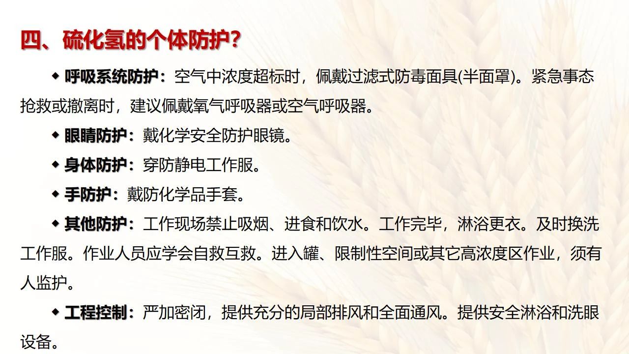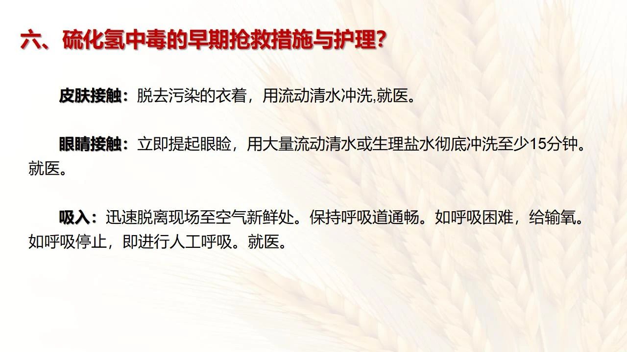 1預(yù)防措施 涉及硫化氫作業(yè)活動,必須嚴(yán)格遵守《化學(xué)品生產(chǎn)單位特殊作業(yè)安全規(guī)范》(GB 30871-2014)及相關(guān)的規(guī)范、標(biāo)準(zhǔn)、制度,并特別注意以下幾點(diǎn): 1.產(chǎn)生硫化氫的生產(chǎn)設(shè)備應(yīng)盡量密閉,并設(shè)置自動報(bào)警裝置(不能根據(jù)臭味來判斷危險(xiǎn)場所硫化氫的濃度,硫化氫達(dá)到一定濃度時(shí)會導(dǎo)致嗅覺麻痹)。 2.對含有硫化氫的廢水、廢氣、廢渣,要進(jìn)行凈化處理,達(dá)到排放標(biāo)準(zhǔn)后方可排放。 3.進(jìn)入可能存在硫化氫的密閉容器、坑、窯、地溝等工作場所,應(yīng)首先測定該場所硫化氫濃度,采取通風(fēng)排毒措施,確認(rèn)安全后方可操作。作業(yè)過程中應(yīng)連續(xù)測定硫化氫濃度。 4.操作時(shí)做好個(gè)人防護(hù)措施,配好防毒用具(防毒面具一般為逃生自救用),作業(yè)工人腰間縛以救護(hù)帶或繩子。做好互保,要2人以上人員在場。 5.患有肝炎、腎病、氣管炎的人員不得從事接觸硫化氫作業(yè)。 6.加強(qiáng)員工有關(guān)專業(yè)安全知識技能的培訓(xùn),提高自我防護(hù)意識和能力。 2作業(yè)有關(guān)注意事項(xiàng) (1)檢查采樣器是否完好,采用密閉取樣; (2)佩戴便攜式有毒有害(硫化氫)氣體檢測儀、適用的防毒用具,站在上風(fēng)向,并有專人監(jiān)護(hù); (3)采樣過程中手閥應(yīng)慢慢打開,不要用扳手敲打閥門。 (1)佩戴便攜式有毒有害(硫化氫)氣體檢測儀、適用的防毒用具,站在上風(fēng)向,并有專人監(jiān)護(hù); (2)切水閥與切水口應(yīng)有一定距離; (3)脫出的酸性氣要用氫氧化鈣或氫氧化鈉溶液中和,并有隔離措施,防止過路行人中毒; (4)切水過程中人不能離開現(xiàn)場。 需進(jìn)入設(shè)備、容器進(jìn)行檢修,應(yīng)經(jīng)過加盲板、吹掃、置換、采樣分析合格、辦理進(jìn)設(shè)備容器安全作業(yè)票后,才能進(jìn)入作業(yè)。但有些設(shè)備容器在檢修前,需進(jìn)人排除殘余的油泥、余渣,清理過程中會散發(fā)出硫化氫和油氣等有毒有害氣體,必須做好安全措施。以下七項(xiàng)為設(shè)備內(nèi)檢修作業(yè)步驟: (1)制定施工方案; (2)作業(yè)人員經(jīng)過安全技術(shù)培訓(xùn); (3)進(jìn)設(shè)備容器作業(yè)前,必須作好氣體采樣分析; (4)辦理進(jìn)入受限空間安全作業(yè)票; (5)佩戴防毒用具(空呼等),攜帶好安全帶(繩); (6)作業(yè)時(shí)間不宜過長,一般不超過30min; (7)施工過程須有專人監(jiān)護(hù),必要時(shí)應(yīng)有醫(yī)務(wù)人員在場。 (1)執(zhí)行進(jìn)入受限空間作業(yè)安全防護(hù)規(guī)定; (2)控制各種物料的切水排凝進(jìn)入下水道; (3)采用強(qiáng)制通風(fēng)或自然通風(fēng),保證氧含量為18%-21%,在富氧環(huán)境下不應(yīng)大于23.5%; (4)配帶防毒用具(空呼等); (5)攜帶好安全帶(繩); (6)進(jìn)入下水道內(nèi)作業(yè)井下要設(shè)專人監(jiān)護(hù),并與地面保持密切聯(lián)系。 (1)下油池清理前,必須用泵把污油、污水抽干凈,用高壓水沖洗置換; (2)采樣分析,根據(jù)測定結(jié)果確定施工方案和安全措施,辦理好進(jìn)入受限空間作業(yè)票。 (3)配備防毒用具(空呼等),有專人監(jiān)護(hù),必要時(shí)要攜好安全帶(繩); 設(shè)備、容器、管線存有硫化氫物料的堵漏、拆卸或安裝作業(yè)時(shí),必須做到: (1)嚴(yán)格控制帶壓作業(yè),應(yīng)把與其設(shè)備容器相通的閥門關(guān)死,安裝盲板,撤掉余壓;辦理相應(yīng)安全作業(yè)票; (2)佩戴適用的防毒用具(空呼等),有專人監(jiān)護(hù); (3)拆卸法蘭螺絲時(shí),在松動之前,不要把螺絲全部拆開,嚴(yán)防有毒氣體大量沖出。 (1)平穩(wěn)操作,嚴(yán)防跑、冒、滴、漏; (2)裝置易泄漏或氣體易積聚的位置應(yīng)安裝固定式硫化氫檢測報(bào)警器; (3)加強(qiáng)機(jī)泵設(shè)備的維護(hù)管理,減少泄漏; (4)可能有泄漏的地方加強(qiáng)通風(fēng); (5)涉及硫化氫物料的容器、管線、閥門等要定期檢查更換; (6)發(fā)現(xiàn)硫化氫濃度高,要先報(bào)告,采取一定防護(hù)措施后,才能進(jìn)入現(xiàn)場檢查和處理。 (1)嚴(yán)禁在進(jìn)、出油及調(diào)合過程中進(jìn)行人工檢尺、測溫及拆裝安全附件等作業(yè); (2)必要的檢查、切水,操作人員應(yīng)佩戴便攜式有毒有害(硫化氫)氣體檢測儀,站在上風(fēng)向,并有專人監(jiān)護(hù); (3)準(zhǔn)備好適合的防毒面具,以便急用。 涉及有可能存在產(chǎn)生(逸出、外泄)硫化氫或者殘存硫化氫的清洗作業(yè)時(shí),應(yīng)事先進(jìn)行風(fēng)險(xiǎn)辨識分析,并結(jié)合分析結(jié)果采取安全措施。