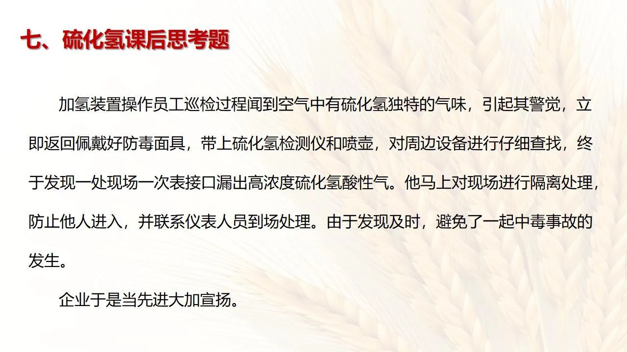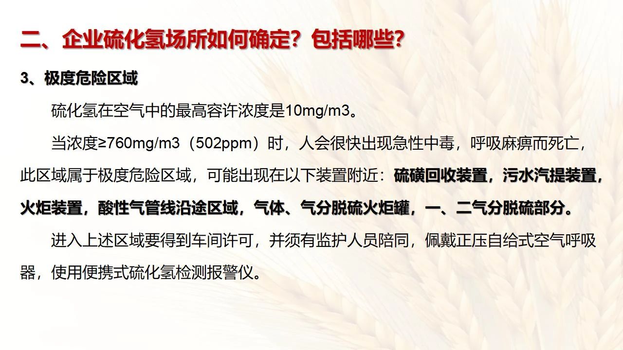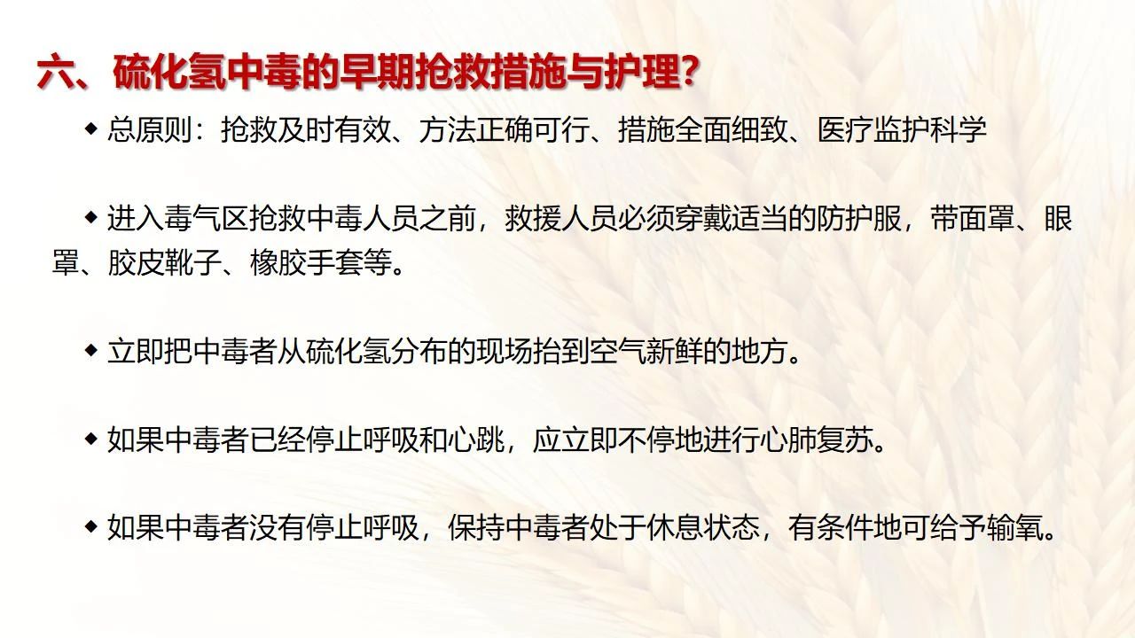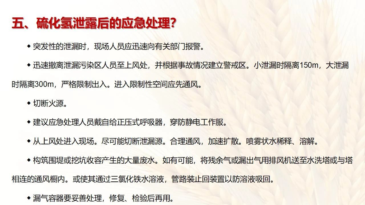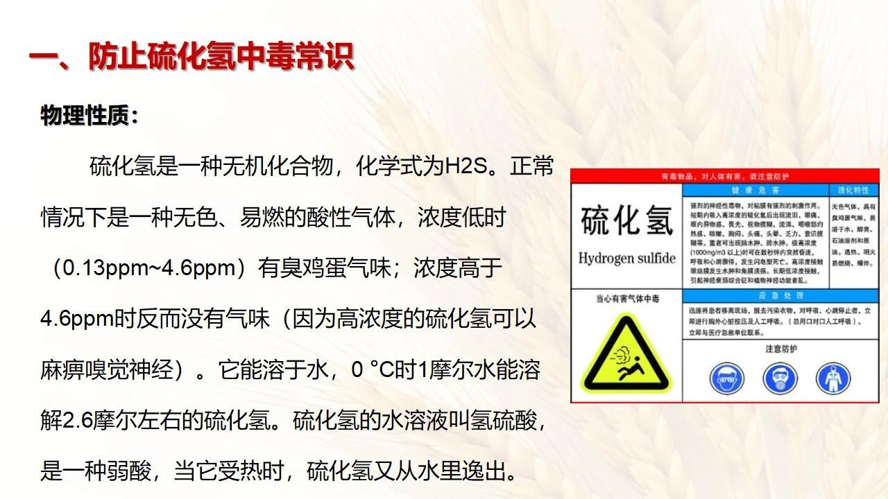 1預(yù)防措施 涉及硫化氫作業(yè)活動,必須嚴(yán)格遵守《化學(xué)品生產(chǎn)單位特殊作業(yè)安全規(guī)范》(GB 30871-2014)及相關(guān)的規(guī)范、標(biāo)準(zhǔn)、制度,并特別注意以下幾點(diǎn): 1.產(chǎn)生硫化氫的生產(chǎn)設(shè)備應(yīng)盡量密閉,并設(shè)置自動報(bào)警裝置(不能根據(jù)臭味來判斷危險(xiǎn)場所硫化氫的濃度,硫化氫達(dá)到一定濃度時(shí)會導(dǎo)致嗅覺麻痹)。 2.對含有硫化氫的廢水、廢氣、廢渣,要進(jìn)行凈化處理,達(dá)到排放標(biāo)準(zhǔn)后方可排放。 3.進(jìn)入可能存在硫化氫的密閉容器、坑、窯、地溝等工作場所,應(yīng)首先測定該場所硫化氫濃度,采取通風(fēng)排毒措施,確認(rèn)安全后方可操作。作業(yè)過程中應(yīng)連續(xù)測定硫化氫濃度。 4.操作時(shí)做好個(gè)人防護(hù)措施,配好防毒用具(防毒面具一般為逃生自救用),作業(yè)工人腰間縛以救護(hù)帶或繩子。做好互保,要2人以上人員在場。 5.患有肝炎、腎病、氣管炎的人員不得從事接觸硫化氫作業(yè)。 6.加強(qiáng)員工有關(guān)專業(yè)安全知識技能的培訓(xùn),提高自我防護(hù)意識和能力。 2作業(yè)有關(guān)注意事項(xiàng) (1)檢查采樣器是否完好,采用密閉取樣; (2)佩戴便攜式有毒有害(硫化氫)氣體檢測儀、適用的防毒用具,站在上風(fēng)向,并有專人監(jiān)護(hù); (3)采樣過程中手閥應(yīng)慢慢打開,不要用扳手敲打閥門。 (1)佩戴便攜式有毒有害(硫化氫)氣體檢測儀、適用的防毒用具,站在上風(fēng)向,并有專人監(jiān)護(hù); (2)切水閥與切水口應(yīng)有一定距離; (3)脫出的酸性氣要用氫氧化鈣或氫氧化鈉溶液中和,并有隔離措施,防止過路行人中毒; (4)切水過程中人不能離開現(xiàn)場。 需進(jìn)入設(shè)備、容器進(jìn)行檢修,應(yīng)經(jīng)過加盲板、吹掃、置換、采樣分析合格、辦理進(jìn)設(shè)備容器安全作業(yè)票后,才能進(jìn)入作業(yè)。但有些設(shè)備容器在檢修前,需進(jìn)人排除殘余的油泥、余渣,清理過程中會散發(fā)出硫化氫和油氣等有毒有害氣體,必須做好安全措施。以下七項(xiàng)為設(shè)備內(nèi)檢修作業(yè)步驟: (1)制定施工方案; (2)作業(yè)人員經(jīng)過安全技術(shù)培訓(xùn); (3)進(jìn)設(shè)備容器作業(yè)前,必須作好氣體采樣分析; (4)辦理進(jìn)入受限空間安全作業(yè)票; (5)佩戴防毒用具(空呼等),攜帶好安全帶(繩); (6)作業(yè)時(shí)間不宜過長,一般不超過30min; (7)施工過程須有專人監(jiān)護(hù),必要時(shí)應(yīng)有醫(yī)務(wù)人員在場。 (1)執(zhí)行進(jìn)入受限空間作業(yè)安全防護(hù)規(guī)定; (2)控制各種物料的切水排凝進(jìn)入下水道; (3)采用強(qiáng)制通風(fēng)或自然通風(fēng),保證氧含量為18%-21%,在富氧環(huán)境下不應(yīng)大于23.5%; (4)配帶防毒用具(空呼等); (5)攜帶好安全帶(繩); (6)進(jìn)入下水道內(nèi)作業(yè)井下要設(shè)專人監(jiān)護(hù),并與地面保持密切聯(lián)系。 (1)下油池清理前,必須用泵把污油、污水抽干凈,用高壓水沖洗置換; (2)采樣分析,根據(jù)測定結(jié)果確定施工方案和安全措施,辦理好進(jìn)入受限空間作業(yè)票。 (3)配備防毒用具(空呼等),有專人監(jiān)護(hù),必要時(shí)要攜好安全帶(繩); 設(shè)備、容器、管線存有硫化氫物料的堵漏、拆卸或安裝作業(yè)時(shí),必須做到: (1)嚴(yán)格控制帶壓作業(yè),應(yīng)把與其設(shè)備容器相通的閥門關(guān)死,安裝盲板,撤掉余壓;辦理相應(yīng)安全作業(yè)票; (2)佩戴適用的防毒用具(空呼等),有專人監(jiān)護(hù); (3)拆卸法蘭螺絲時(shí),在松動之前,不要把螺絲全部拆開,嚴(yán)防有毒氣體大量沖出。 (1)平穩(wěn)操作,嚴(yán)防跑、冒、滴、漏; (2)裝置易泄漏或氣體易積聚的位置應(yīng)安裝固定式硫化氫檢測報(bào)警器; (3)加強(qiáng)機(jī)泵設(shè)備的維護(hù)管理,減少泄漏; (4)可能有泄漏的地方加強(qiáng)通風(fēng); (5)涉及硫化氫物料的容器、管線、閥門等要定期檢查更換; (6)發(fā)現(xiàn)硫化氫濃度高,要先報(bào)告,采取一定防護(hù)措施后,才能進(jìn)入現(xiàn)場檢查和處理。 (1)嚴(yán)禁在進(jìn)、出油及調(diào)合過程中進(jìn)行人工檢尺、測溫及拆裝安全附件等作業(yè); (2)必要的檢查、切水,操作人員應(yīng)佩戴便攜式有毒有害(硫化氫)氣體檢測儀,站在上風(fēng)向,并有專人監(jiān)護(hù); (3)準(zhǔn)備好適合的防毒面具,以便急用。 涉及有可能存在產(chǎn)生(逸出、外泄)硫化氫或者殘存硫化氫的清洗作業(yè)時(shí),應(yīng)事先進(jìn)行風(fēng)險(xiǎn)辨識分析,并結(jié)合分析結(jié)果采取安全措施。