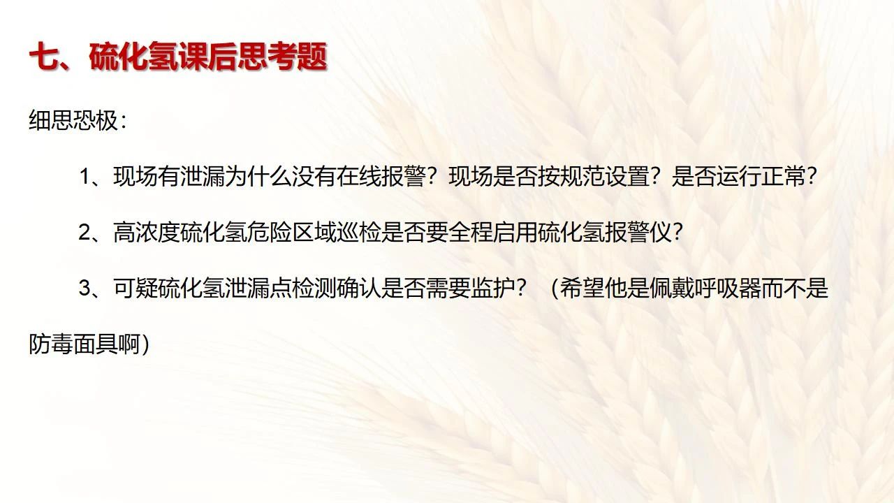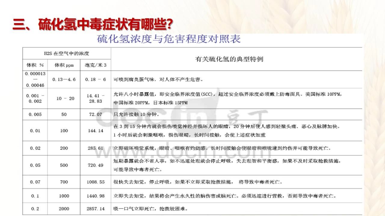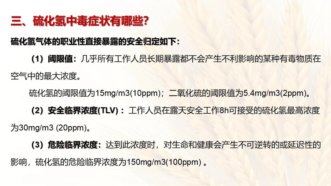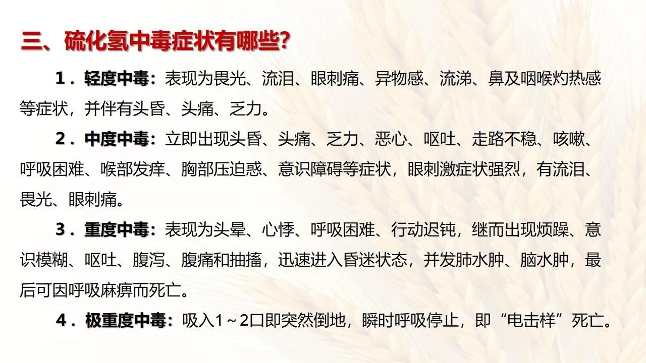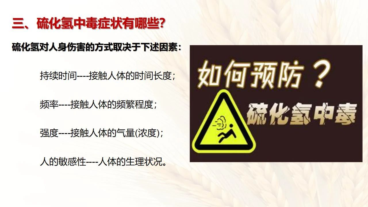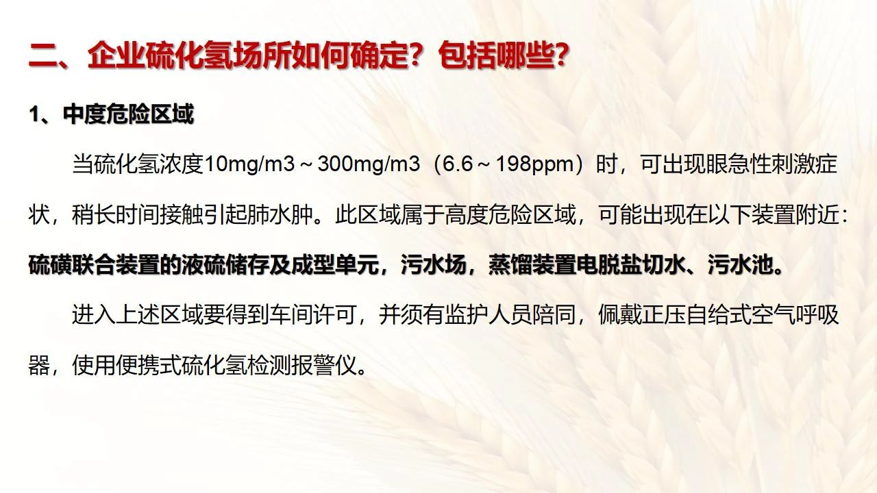 1預(yù)防措施 涉及硫化氫作業(yè)活動,必須嚴(yán)格遵守《化學(xué)品生產(chǎn)單位特殊作業(yè)安全規(guī)范》(GB 30871-2014)及相關(guān)的規(guī)范、標(biāo)準(zhǔn)、制度,并特別注意以下幾點(diǎn): 1.產(chǎn)生硫化氫的生產(chǎn)設(shè)備應(yīng)盡量密閉,并設(shè)置自動報(bào)警裝置(不能根據(jù)臭味來判斷危險(xiǎn)場所硫化氫的濃度,硫化氫達(dá)到一定濃度時(shí)會導(dǎo)致嗅覺麻痹)。 2.對含有硫化氫的廢水、廢氣、廢渣,要進(jìn)行凈化處理,達(dá)到排放標(biāo)準(zhǔn)后方可排放。 3.進(jìn)入可能存在硫化氫的密閉容器、坑、窯、地溝等工作場所,應(yīng)首先測定該場所硫化氫濃度,采取通風(fēng)排毒措施,確認(rèn)安全后方可操作。作業(yè)過程中應(yīng)連續(xù)測定硫化氫濃度。 4.操作時(shí)做好個(gè)人防護(hù)措施,配好防毒用具(防毒面具一般為逃生自救用),作業(yè)工人腰間縛以救護(hù)帶或繩子。做好互保,要2人以上人員在場。 5.患有肝炎、腎病、氣管炎的人員不得從事接觸硫化氫作業(yè)。 6.加強(qiáng)員工有關(guān)專業(yè)安全知識技能的培訓(xùn),提高自我防護(hù)意識和能力。 2作業(yè)有關(guān)注意事項(xiàng) (1)檢查采樣器是否完好,采用密閉取樣; (2)佩戴便攜式有毒有害(硫化氫)氣體檢測儀、適用的防毒用具,站在上風(fēng)向,并有專人監(jiān)護(hù); (3)采樣過程中手閥應(yīng)慢慢打開,不要用扳手敲打閥門。 (1)佩戴便攜式有毒有害(硫化氫)氣體檢測儀、適用的防毒用具,站在上風(fēng)向,并有專人監(jiān)護(hù); (2)切水閥與切水口應(yīng)有一定距離; (3)脫出的酸性氣要用氫氧化鈣或氫氧化鈉溶液中和,并有隔離措施,防止過路行人中毒; (4)切水過程中人不能離開現(xiàn)場。 需進(jìn)入設(shè)備、容器進(jìn)行檢修,應(yīng)經(jīng)過加盲板、吹掃、置換、采樣分析合格、辦理進(jìn)設(shè)備容器安全作業(yè)票后,才能進(jìn)入作業(yè)。但有些設(shè)備容器在檢修前,需進(jìn)人排除殘余的油泥、余渣,清理過程中會散發(fā)出硫化氫和油氣等有毒有害氣體,必須做好安全措施。以下七項(xiàng)為設(shè)備內(nèi)檢修作業(yè)步驟: (1)制定施工方案; (2)作業(yè)人員經(jīng)過安全技術(shù)培訓(xùn); (3)進(jìn)設(shè)備容器作業(yè)前,必須作好氣體采樣分析; (4)辦理進(jìn)入受限空間安全作業(yè)票; (5)佩戴防毒用具(空呼等),攜帶好安全帶(繩); (6)作業(yè)時(shí)間不宜過長,一般不超過30min; (7)施工過程須有專人監(jiān)護(hù),必要時(shí)應(yīng)有醫(yī)務(wù)人員在場。 (1)執(zhí)行進(jìn)入受限空間作業(yè)安全防護(hù)規(guī)定; (2)控制各種物料的切水排凝進(jìn)入下水道; (3)采用強(qiáng)制通風(fēng)或自然通風(fēng),保證氧含量為18%-21%,在富氧環(huán)境下不應(yīng)大于23.5%; (4)配帶防毒用具(空呼等); (5)攜帶好安全帶(繩); (6)進(jìn)入下水道內(nèi)作業(yè)井下要設(shè)專人監(jiān)護(hù),并與地面保持密切聯(lián)系。 (1)下油池清理前,必須用泵把污油、污水抽干凈,用高壓水沖洗置換; (2)采樣分析,根據(jù)測定結(jié)果確定施工方案和安全措施,辦理好進(jìn)入受限空間作業(yè)票。 (3)配備防毒用具(空呼等),有專人監(jiān)護(hù),必要時(shí)要攜好安全帶(繩); 設(shè)備、容器、管線存有硫化氫物料的堵漏、拆卸或安裝作業(yè)時(shí),必須做到: (1)嚴(yán)格控制帶壓作業(yè),應(yīng)把與其設(shè)備容器相通的閥門關(guān)死,安裝盲板,撤掉余壓;辦理相應(yīng)安全作業(yè)票; (2)佩戴適用的防毒用具(空呼等),有專人監(jiān)護(hù); (3)拆卸法蘭螺絲時(shí),在松動之前,不要把螺絲全部拆開,嚴(yán)防有毒氣體大量沖出。 (1)平穩(wěn)操作,嚴(yán)防跑、冒、滴、漏; (2)裝置易泄漏或氣體易積聚的位置應(yīng)安裝固定式硫化氫檢測報(bào)警器; (3)加強(qiáng)機(jī)泵設(shè)備的維護(hù)管理,減少泄漏; (4)可能有泄漏的地方加強(qiáng)通風(fēng); (5)涉及硫化氫物料的容器、管線、閥門等要定期檢查更換; (6)發(fā)現(xiàn)硫化氫濃度高,要先報(bào)告,采取一定防護(hù)措施后,才能進(jìn)入現(xiàn)場檢查和處理。 (1)嚴(yán)禁在進(jìn)、出油及調(diào)合過程中進(jìn)行人工檢尺、測溫及拆裝安全附件等作業(yè); (2)必要的檢查、切水,操作人員應(yīng)佩戴便攜式有毒有害(硫化氫)氣體檢測儀,站在上風(fēng)向,并有專人監(jiān)護(hù); (3)準(zhǔn)備好適合的防毒面具,以便急用。 涉及有可能存在產(chǎn)生(逸出、外泄)硫化氫或者殘存硫化氫的清洗作業(yè)時(shí),應(yīng)事先進(jìn)行風(fēng)險(xiǎn)辨識分析,并結(jié)合分析結(jié)果采取安全措施。