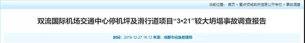 經(jīng)調(diào)查認(rèn)定,雙流國(guó)際機(jī)場(chǎng)交通中心停機(jī)坪及滑行道項(xiàng)目“3·21”坍塌事故是一起生產(chǎn)安全責(zé)任事故,事故等級(jí)為較大事故。