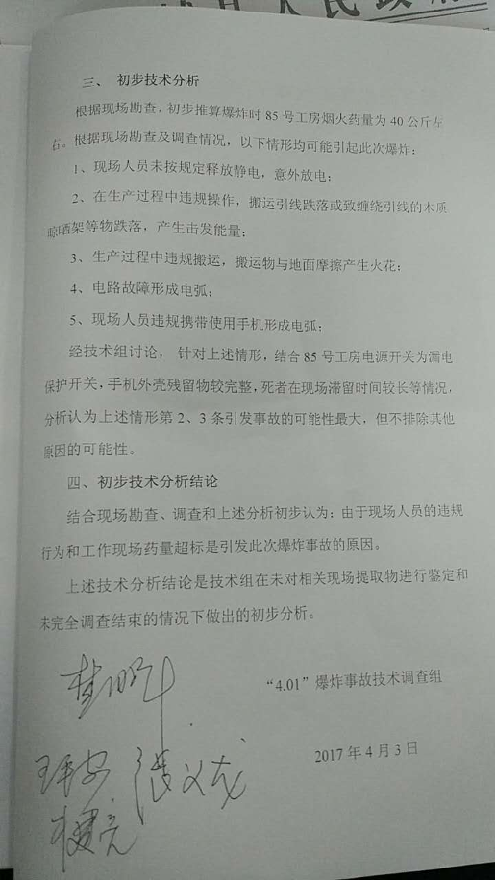 蒲城縣光華花炮引線有限公司繞引工人李亞妮未嚴格執(zhí)行公司上下班制度,下班后仍私自在繞引工房進行繞引作業(yè);繞引工房內超量存放成品引線,違反了《煙花爆竹作業(yè)安全技術規(guī)程》規(guī)定(依據“4.01”事故調查技術組的初步技術分析報告),引發(fā)燃燒爆炸。