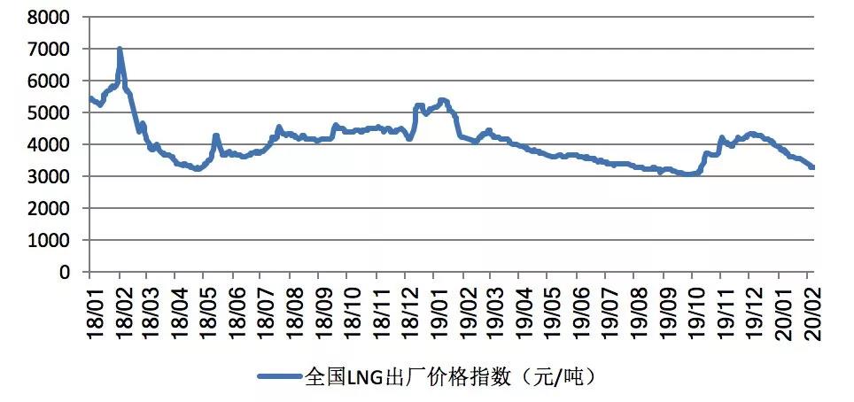 國內LNG需求的低迷導致其價格也承壓下行。根據上海石油天然氣交易中心發(fā)布的全國LNG出廠價格指數(shù)測算,2月7日,全國LNG出廠價為3277元/噸,與去年同期高于4000元/噸的價格水平下跌18%,較2019年12月31日的3929元/噸的價格水平下跌652元/噸,跌幅為16.6%。
