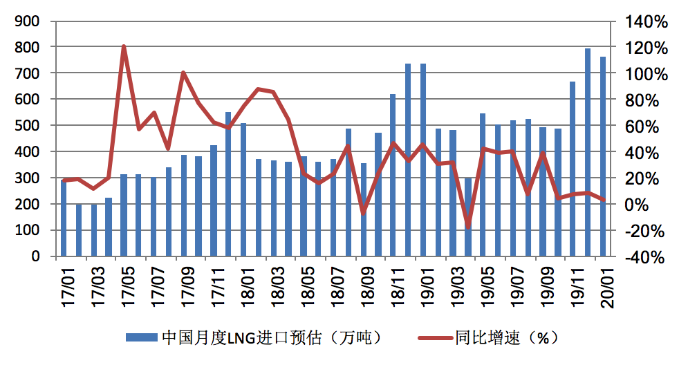新華能源E-gas數(shù)據平臺的預測結果顯示,2020年1月份,中國LNG進口量預計為763萬噸,較去年同期增長3.4%,較2019年12月減少3.9%。