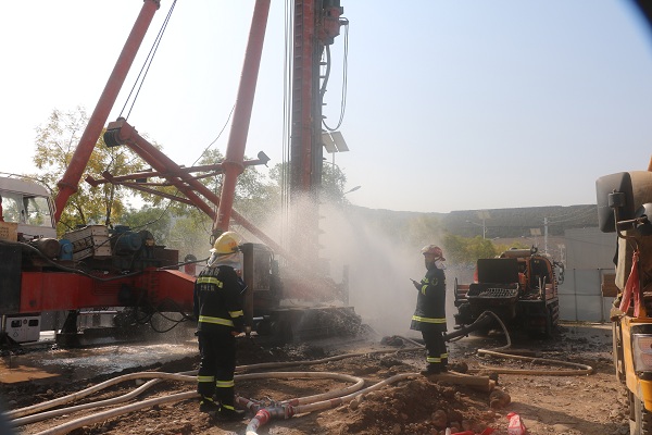 蘭州支隊(duì)七里河消防大隊(duì)第一時(shí)間到達(dá)現(xiàn)場(chǎng)參與處置,到達(dá)現(xiàn)場(chǎng)后發(fā)現(xiàn):現(xiàn)場(chǎng)管道仍處于天然氣泄漏狀態(tài),未有明火發(fā)生。現(xiàn)場(chǎng)指戰(zhàn)員立即設(shè)置警戒線,對(duì)現(xiàn)場(chǎng)圍觀施工人員及群眾進(jìn)行疏散撤離,對(duì)泄露事故點(diǎn)毗鄰居民樓進(jìn)行人員通告疏散,同時(shí)設(shè)置水槍防護(hù)陣地。隨著增援中隊(duì)處置力量的到達(dá),現(xiàn)場(chǎng)處置指揮員七里河大隊(duì)大隊(duì)長(zhǎng),統(tǒng)一指揮調(diào)度現(xiàn)場(chǎng)事故處置力量:首先,結(jié)合現(xiàn)場(chǎng)街道路況,設(shè)置疏散組,對(duì)毗鄰居民樓全面進(jìn)行人員清查疏散。設(shè)置警戒組并專人看守,嚴(yán)防非事故處置人員進(jìn)入。然后在先期到達(dá)成立的消防水槍防護(hù)陣地基礎(chǔ)上,增設(shè)水槍防護(hù)陣地;其次調(diào)派到達(dá)現(xiàn)場(chǎng)的增援消防中隊(duì)兩臺(tái)水罐消防車全程待命,做好供水保障。