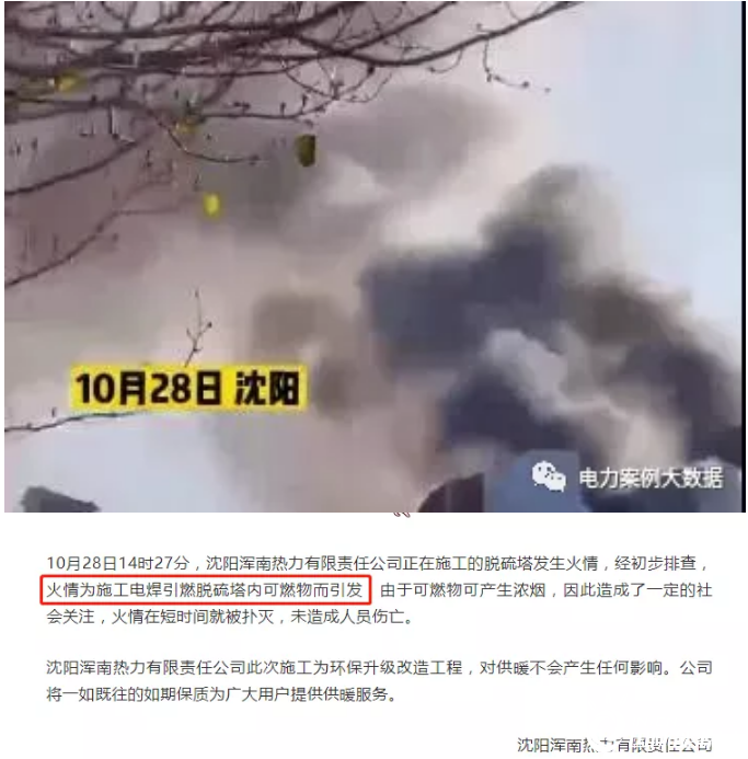 10月28日14時(shí)27分,沈陽渾南熱力有限責(zé)任公司正在施工的脫硫塔發(fā)生火情,經(jīng)初步排查,火情為施工電焊引燃脫硫塔內(nèi)可燃物而引發(fā),由于可燃物可產(chǎn)生濃煙,因此造成了一定的社會關(guān)注,火情在短時(shí)間就被撲滅,未造成人員傷亡。