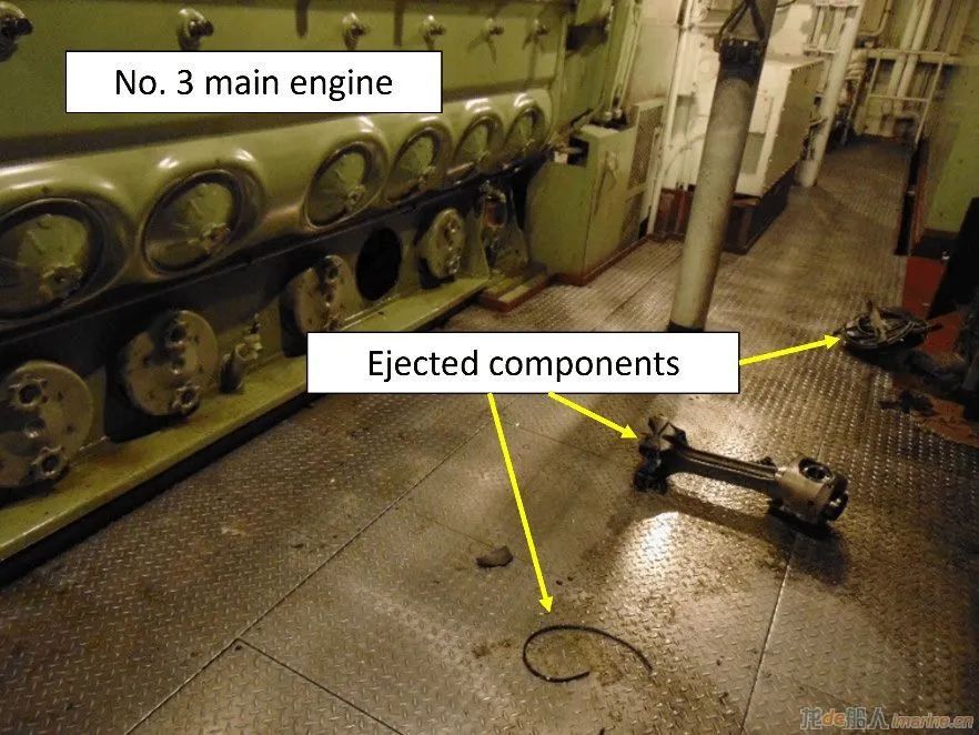 在煙霧開始消散,主機(jī)周邊降溫后,船員認(rèn)為沒有必要使用消防水槍或二氧化碳消防系統(tǒng)。在“Wenatchee”號(hào)安全抵達(dá)泊位后,工程師再次進(jìn)入機(jī)艙,并發(fā)現(xiàn)三號(hào)發(fā)動(dòng)機(jī)旁邊散落的一些破損部件,包括連桿和一部分活塞。