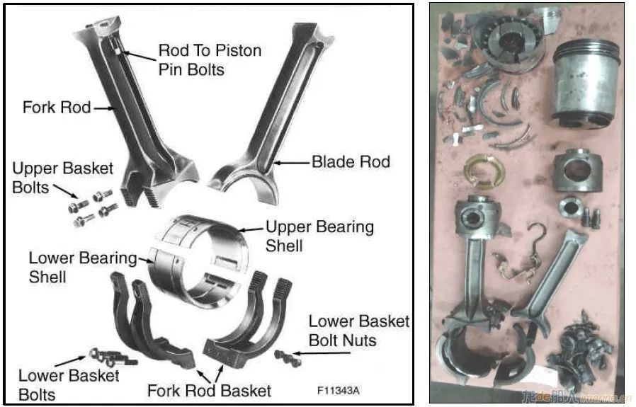 在檢查中,工程師發(fā)現(xiàn)6號(hào)曲柄銷(用于6號(hào)和14號(hào)氣缸)的連桿和活塞處于“完全損壞狀態(tài)”。在油底殼中發(fā)現(xiàn)曲柄總成托架的一個(gè)完整螺栓,同時(shí)在另外一處發(fā)現(xiàn)了緊固螺母,這證明螺栓和螺母是在運(yùn)行過程中脫落的??偝傻钠渌菟ň捎诶爝^度而發(fā)生變形及斷裂。