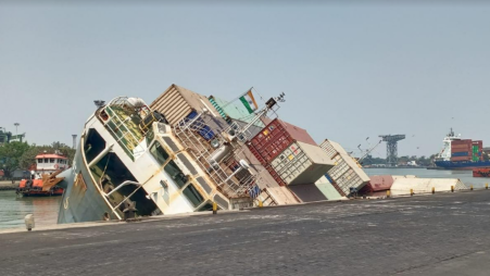 加爾各答港口官員報告說,這艘船于3月22日從印度薩加爾港抵達加爾各答,在3月24日上午剛剛完成裝載,總共裝載了165 個集裝箱,包括120個 20 英尺集裝箱和45 個 40英尺集裝箱。該船原定于今天啟程前往孟加拉國吉大港,然而突然在沒有任何征兆的情況下發(fā)生傾斜,并在15分鐘內(nèi)側翻和部分沉沒,導致集裝箱掉入港口。