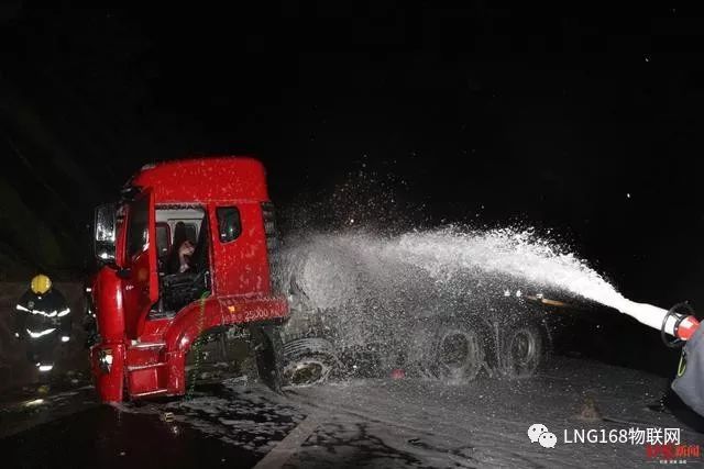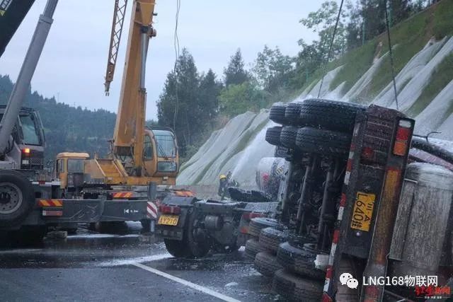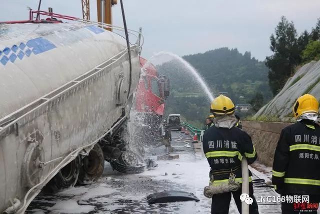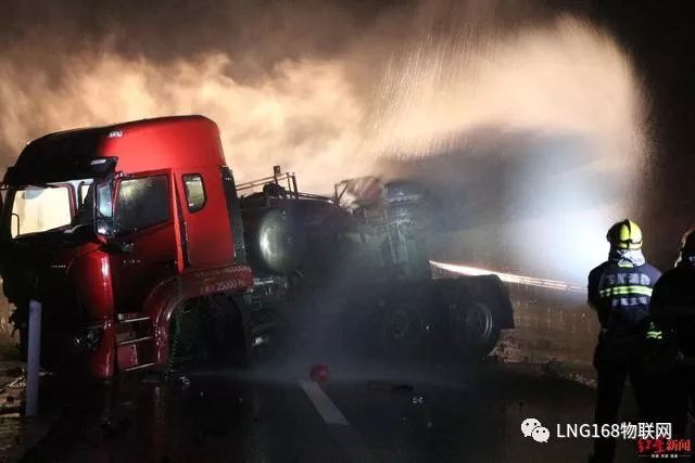 消防救援人員介紹,由于事故車輛為L(zhǎng)NG(液化天然氣)動(dòng)力,事故導(dǎo)致LNG氣罐閥門變形泄漏,且LNG儲(chǔ)存罐處于滿載狀態(tài),如發(fā)生爆炸燃燒后果不堪設(shè)想。根據(jù)現(xiàn)場(chǎng)情況,救援人員決定采取放空稀釋的方法進(jìn)行處置。隨后,救援行動(dòng)展開,一是高速交警立即對(duì)該路段進(jìn)行封鎖,實(shí)施現(xiàn)場(chǎng)警戒;二是消防救援人員利用開花水槍、泡沫槍分別對(duì)氣罐泄漏點(diǎn)及周邊進(jìn)行稀釋覆蓋,防止發(fā)生次生災(zāi)害。同時(shí),救援人員調(diào)集大型吊車和裝載車對(duì)事故車輛進(jìn)行起吊拖離。