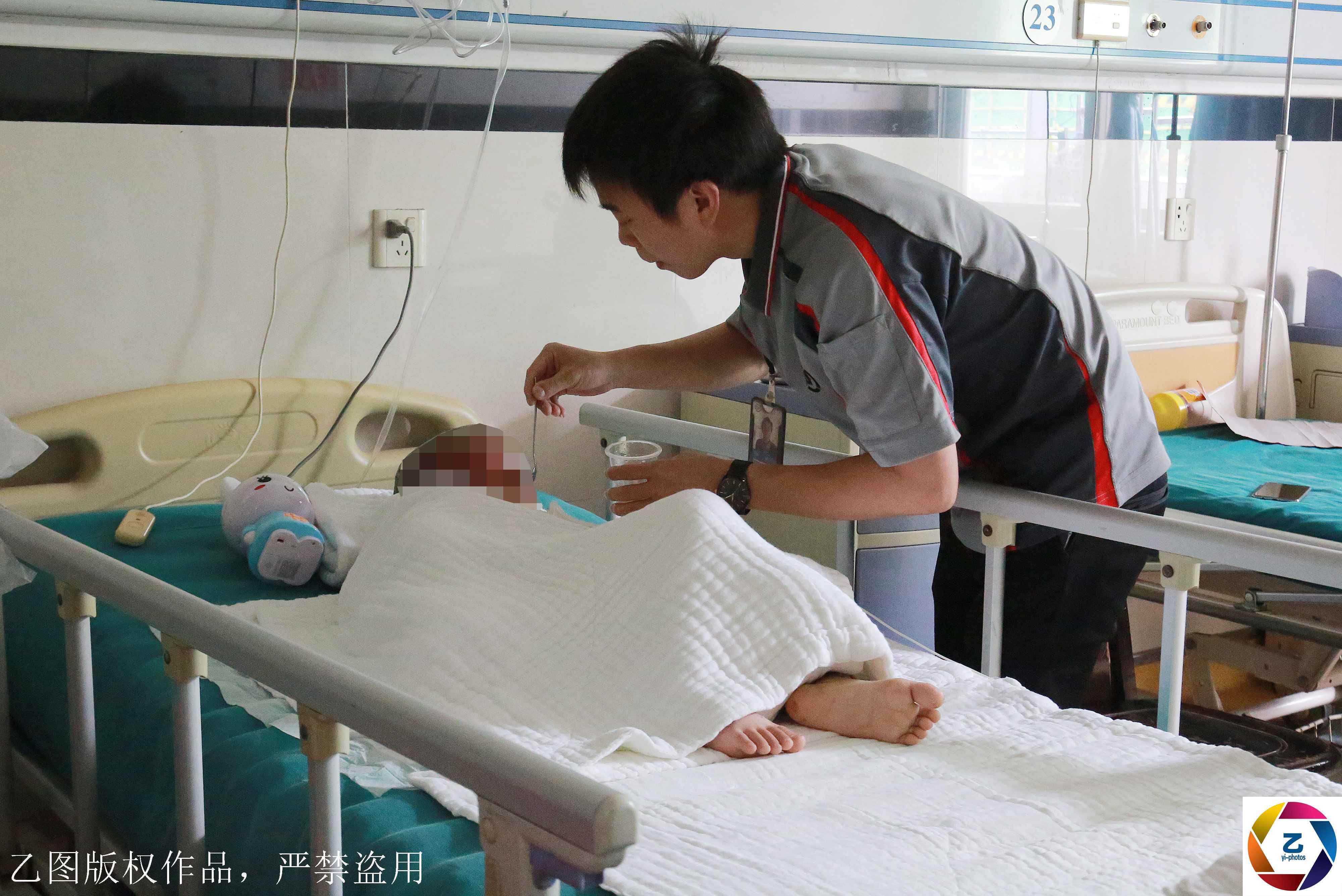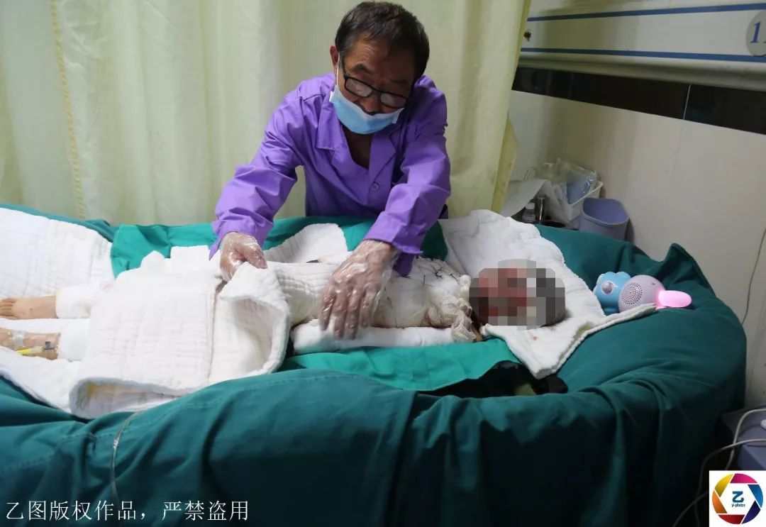 經過搶救,小俊逸幸運活了下來。據悉,小俊逸在爆炸中重度燒傷,深二度達9%,深三度達40%。醫(yī)生說孩子的雙手無法保住,但是馬上截肢孩子會有生命危險,需要先治療一段時間后再做手術。清醒之后的小俊逸不時痛苦地呻吟,他還不知道,爸爸和哥哥已經永遠離開了他。圖為護工在照顧躺在病床上的小俊逸。