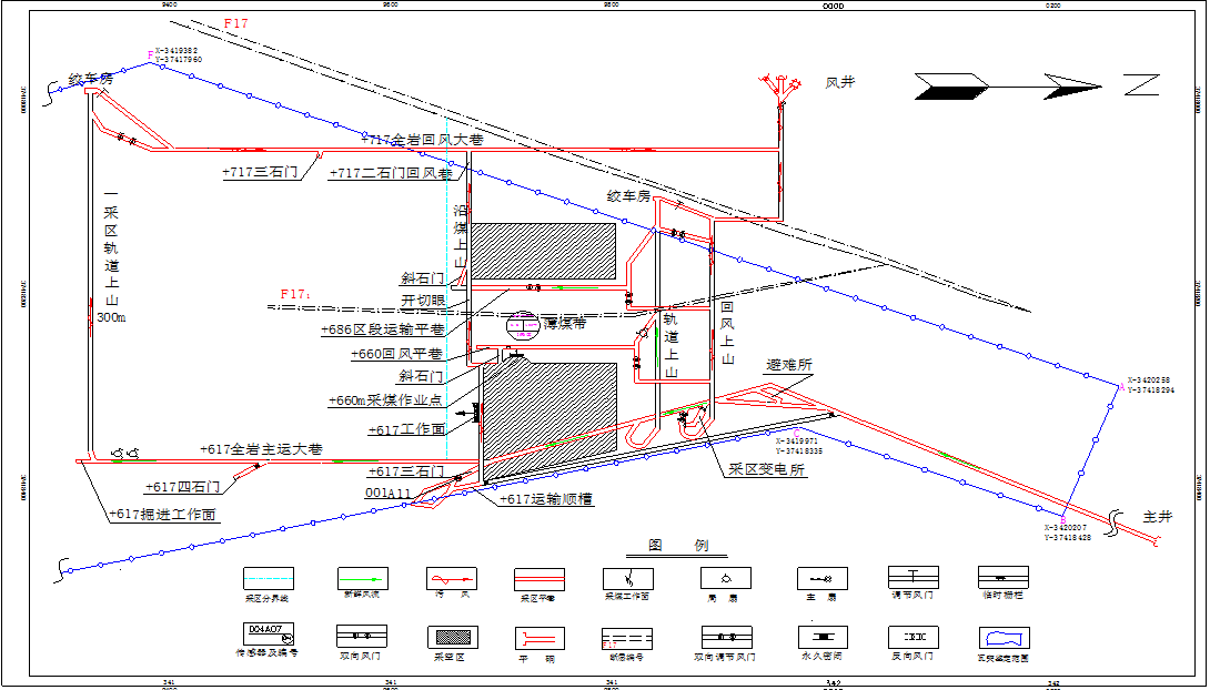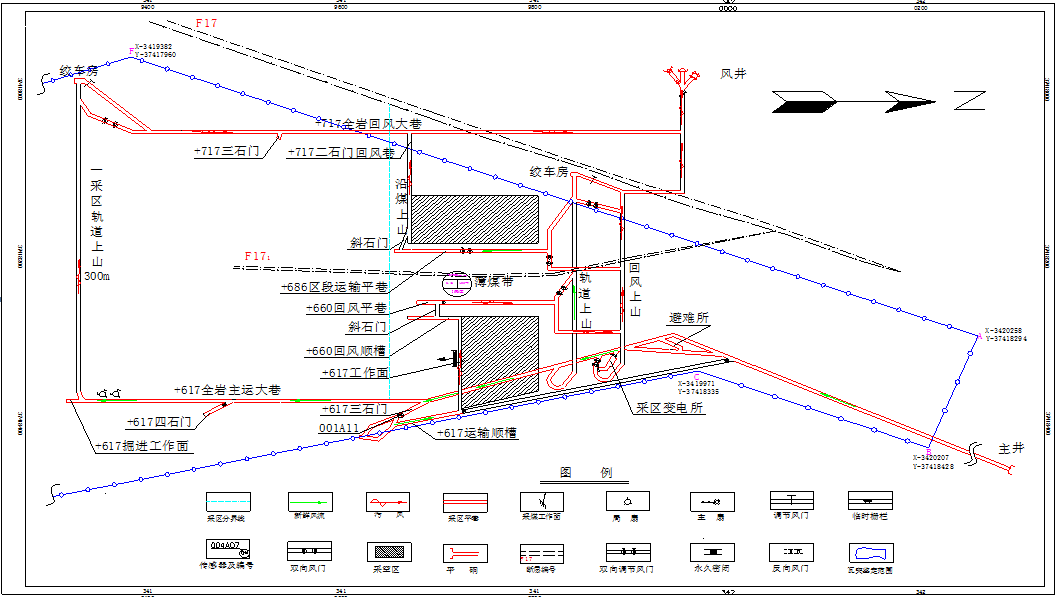 2.主要生產(chǎn)系統(tǒng)。礦井采用平硐上下山開拓,單水平布置。主平硐井口標高+612.73m,副井井口標高+761.70m,風(fēng)井井口標高+758.94m。水平標高為+617m,劃分為4個采區(qū)。其中,+617m水平以上設(shè)置Ⅰ、Ⅱ2個采區(qū),+617m水平以下設(shè)置Ⅲ、Ⅳ2個采區(qū)(見圖1)。礦井主平硐采用CTY2.5-GGB型蓄電池電機車運輸;通風(fēng)方式為中央邊界抽出式通風(fēng),風(fēng)井安裝2臺FBCZ-6-№12防爆抽出式通風(fēng)機,掘進工作面采用局部通風(fēng)機供風(fēng);礦井為單回路供電,配備100KVA柴油發(fā)電機作為備用電源,電壓等級為660V。礦井現(xiàn)生產(chǎn)區(qū)域位于礦區(qū)中部F17斷層以南的Ⅰ采區(qū)。受斷層影響,Ⅰ采區(qū)北部呈一狹長塊段,礦井將該塊段劃分出來,作為邊角煤采區(qū)進行獨立回采,即+617m采煤工作面,礦井編制了《邊角煤采區(qū)設(shè)計》。