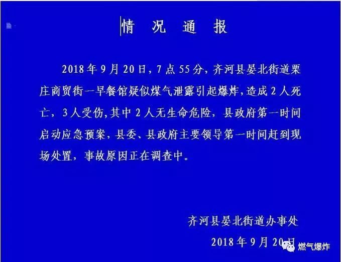 20日上午,10時左右,齊河縣晏北街道辦事處對外發(fā)布《情況通報》稱,2018年9月20日,齊河縣晏北街道栗莊商貿(mào)街一早餐館疑似煤氣泄漏引起爆炸,造成2人死亡,3人受傷,其中2人無生命危險,縣政府第一時間啟動應(yīng)急預(yù)案,縣委、縣政府主要領(lǐng)導(dǎo)第一時間趕到現(xiàn)場處置,事故原因正在調(diào)查中。
